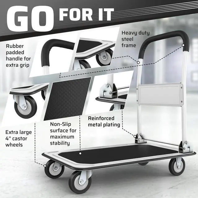 1. COMPACT & FOLDABLE - Are you tired of big, clunky carts that take up precious space? Thats why we designed a functional platform push cart that can be tucked away for easy storage, but ready and available for when you need it. Simply fold down the padded handle in seconds to lay flush on the platform and your cart is ready to stowaway whenever, wherever.