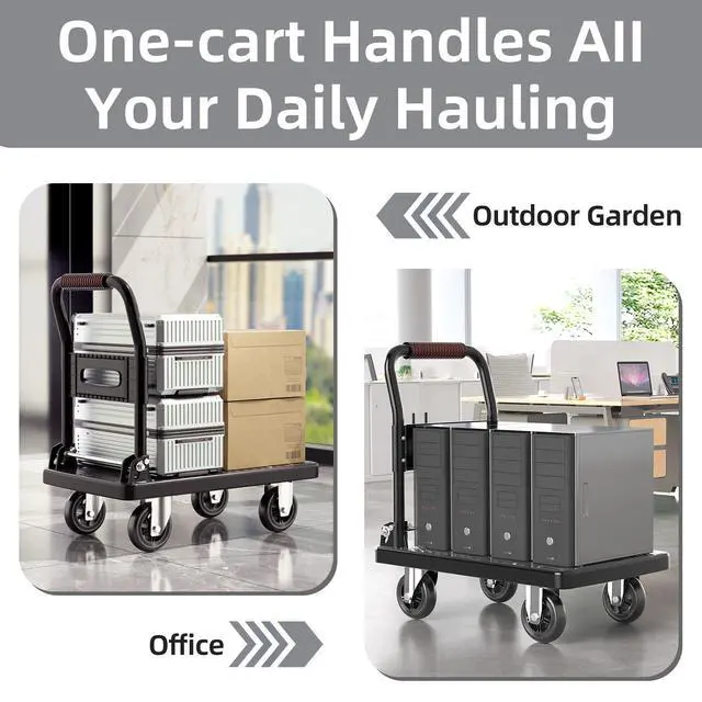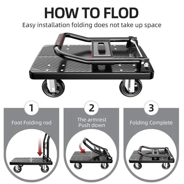 Are you tired of bulky, space-consuming carts? That's why we designed a fully functional platform cart that folds flat for easy storage. Simply fold the padded handle in seconds and it lies flat on the platform, ready to load.
