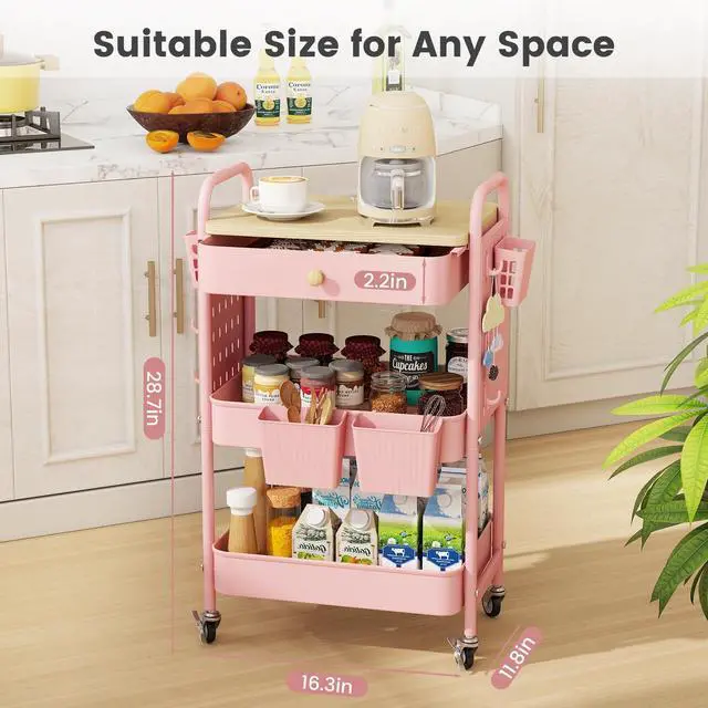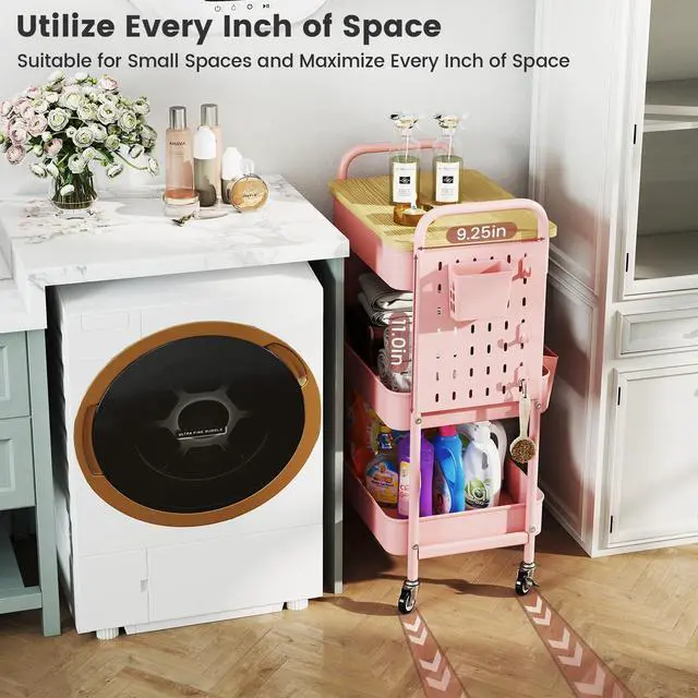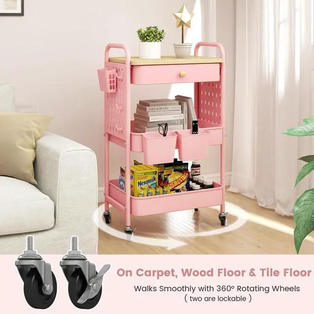 Equipped with two metal pegboards, the snack cart can be used in various way in kitchen, living room or bathroom. You can DIY the pegboard with the added 6 hooks, or buy some accessories for it to store more.