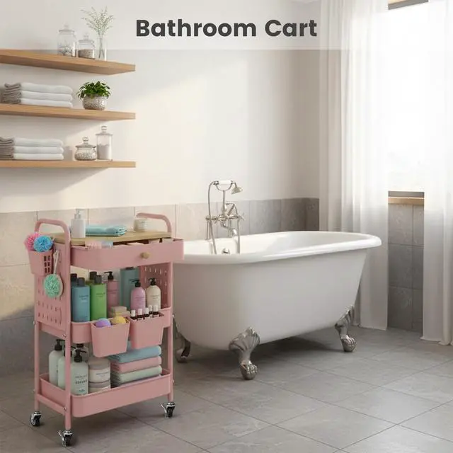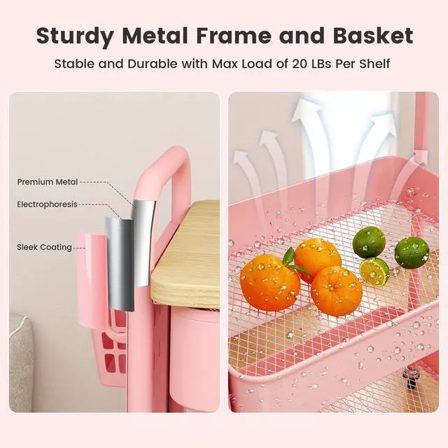 The whole frame and two baskets of this rolling cart are made of metal, sturdy and durable to withstand all the items in your home.