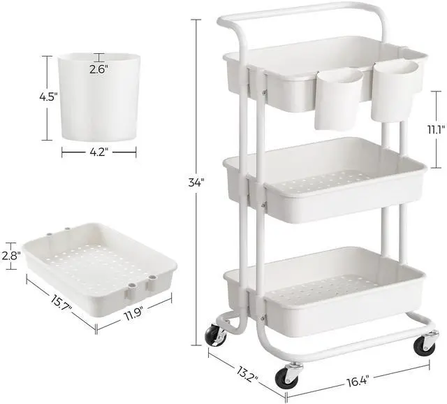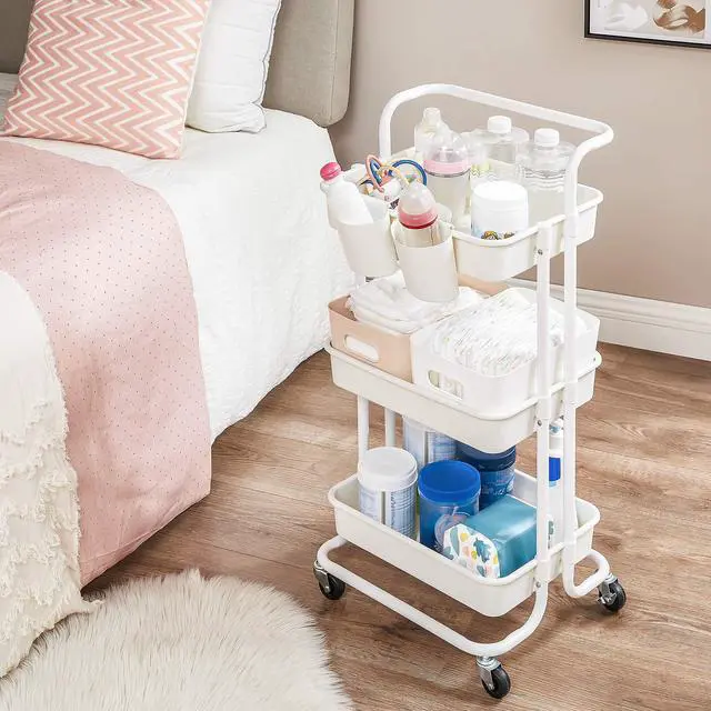 With a robust steel frame, 3 plastic baskets, and 4 smooth rolling casters (2 of them have brakes to secure in place), this SONGMICS 3-tier rolling cart brings more storage to any room it slides in!