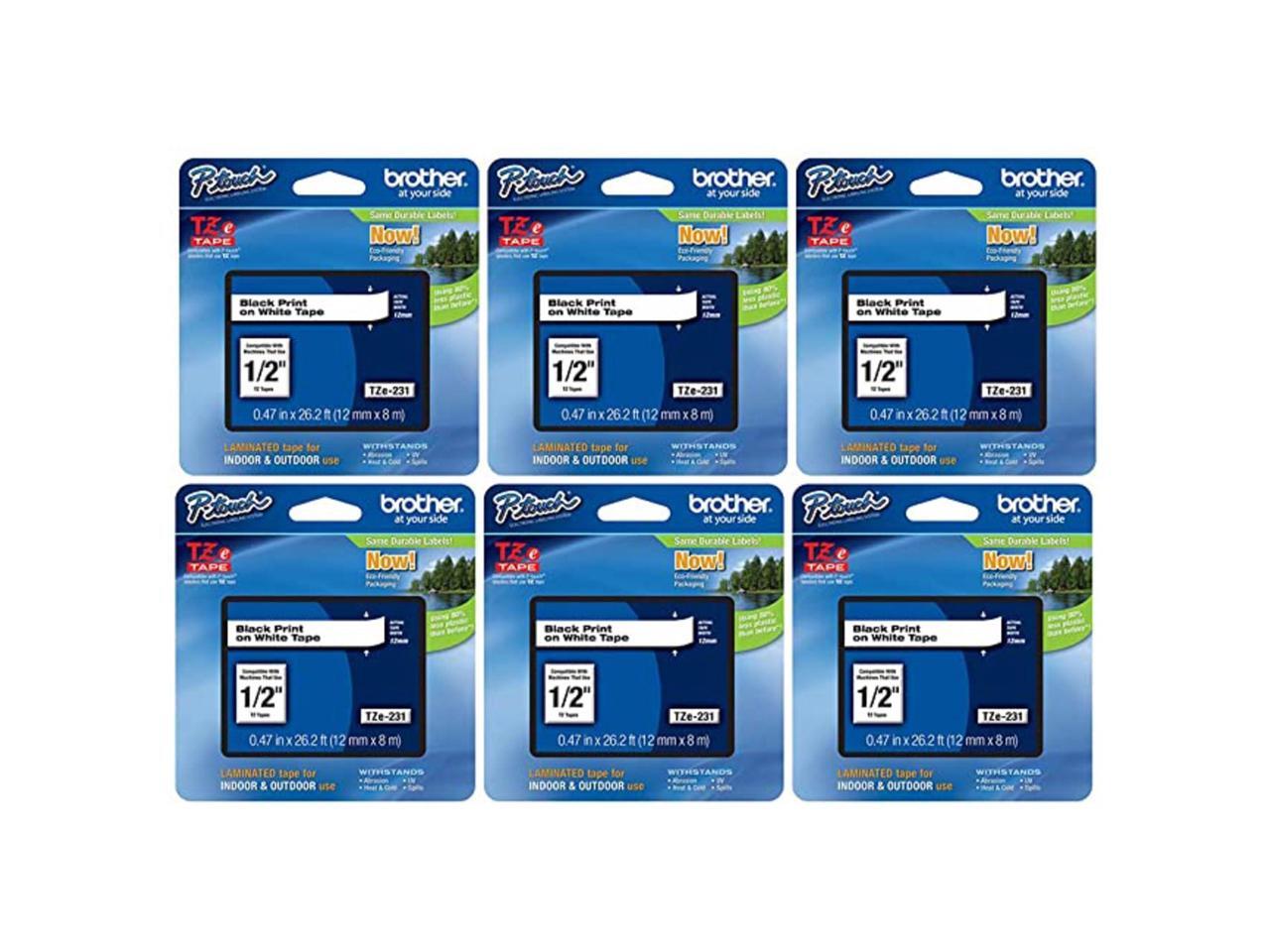 Brother P-touch TZe-231 Laminated Label Maker Tape 1/2" x 26-2/10' Black on White 6/Pack (TZe-2316PKB) TZE-2316PKB