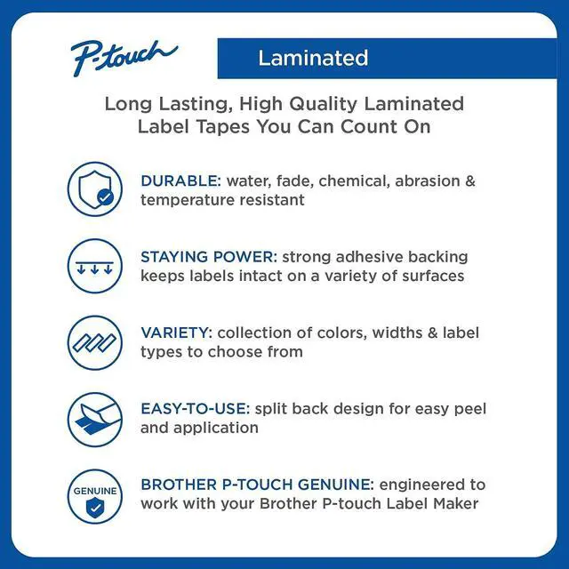 Extensive testing has been performed to ensure that Brother P-touch TZ label is incredibly durable under all kinds of conditions. It holds up extraordinarily well and stays crisp, legible, and affixed, even when subjected to abrasion, extreme temperature, industrial chemicals, and sunlight.