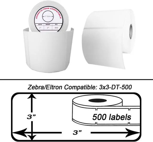 500 Labels per Roll | 3" x 3" | Square | White | Direct Thermal | Permanent-Adhesive | 1" Core | Outside diameter = 3.5" - 4" | Perforation between labels | BPA Free