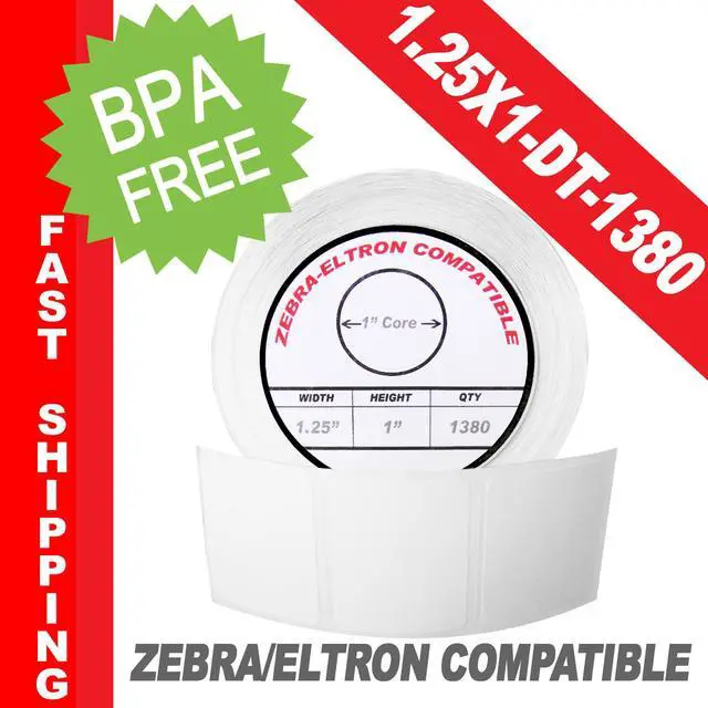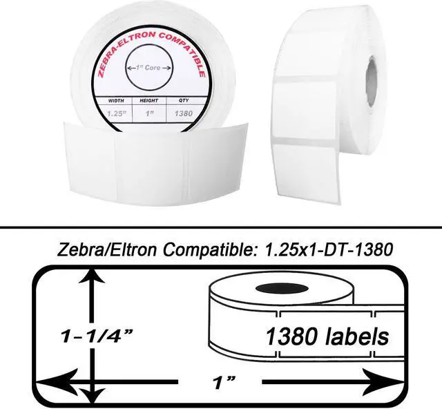 1,380 Labels per Roll | 1-1/4" x 1" | Square | White | Direct Thermal | Permanent-Adhesive | 1" Core | Outside diameter = 3.5" - 4" | Perforation between labels | BPA Free