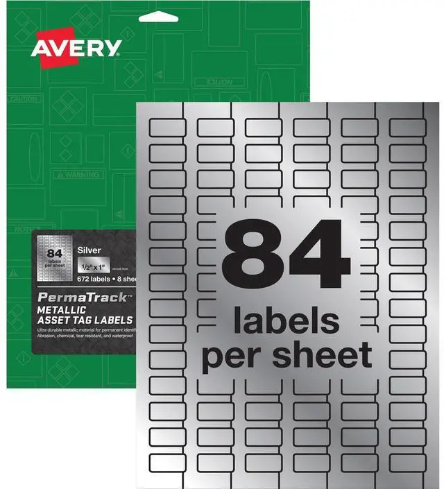 PermaTrack Metallic Asset Tag Labels make it easy to create your own heavy-duty, metallic asset tags; bar-code labels; equipment tags; property tags and nameplates on demand, right from your laser printer. Accurately record and monitor valuable assets such as electronics, equipment, tools, furniture and containers. Labels in matte silver feature a strong adhesive and durable metallic material that is chemical-resistant, waterproof and abrasion-resistant. Customize with text, graphics, serialized numbers and bar codes using the free, online, Avery Design & Print software with bar-code generator. Print as many asset tags as you need when you need them - avoiding high minimum order quantities and long lead times from custom printing services. Labels are optimized for superior print performance to print smoothly without skewing or jamming. Each letter-size sheet includes 84 labels (1/2" x 1").