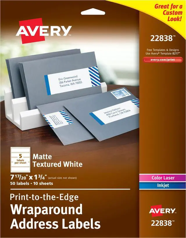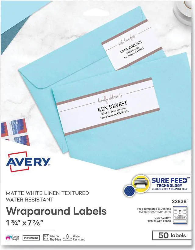 Add a special look and feel to envelopes, gifts, mailings and other items with these versatile labels. Labels are ideal for premium-looking branding and promotional labels. Perfect for event invitations and marketing materials. Permanent labels are guaranteed to stick and stay. Easy to customize with free designs and templates from Avery Design & Print. Perfect for adding a unique touch to almost anything. Textured WhitePrint-to-the-Edge and add color to the entire label. Shape: Rectangular; Label Size - text: 7.85 x 1.75; Label Color(s): Textured White; Color Family: White.