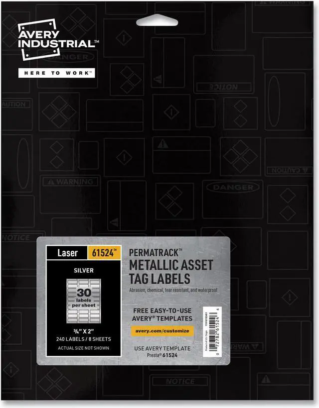 Create your own heavy duty metallic asset tags, barcode labels, equipment tags, property tags and nameplates with a laser printer. Accurately record and monitor valuable assets such as electronics, equipment, tools, furniture, containers and more. Print on demand and as many as you need, avoiding high minimum order quantities and long lead times. Labels feature a strong adhesive and the durable metallic material is chemical resistant, waterproof and abrasion resistant. Customize with text, graphics, serialized numbers and barcodes with the free Avery Design & Print software with barcode generator. Shape: Rectangular; Label Size - text: 0.75 x 2; Label Color(s): Metallic Silver; Color Family: Silver.