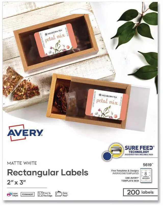 Rectangular Labels with Sure Feed Technology Inkjet/Laser 2 x 3 Matte White 8 Labels/Sheet 25 Sheets/Pack 05619