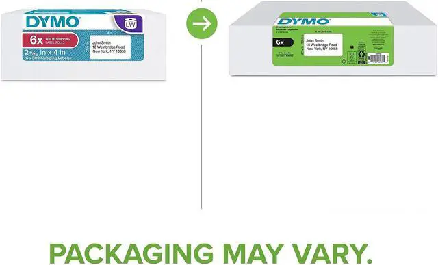 Quickly create perfect shipping labels directly from your DYMO LabelWriter label maker with DYMO LW Shipping Labels. Using a direct thermal printing process, you avoid the hassle of expensive ink or toner. Packaged in rolls, so you can print one shipping label or hundreds with easeno more messy sheets, waste, or sheet label jams. You receive six rolls of white, self-adhesive DYMO LW Shipping Labels with 300 labels each. Labels measure 2 5/16-inches x 4-inches each.