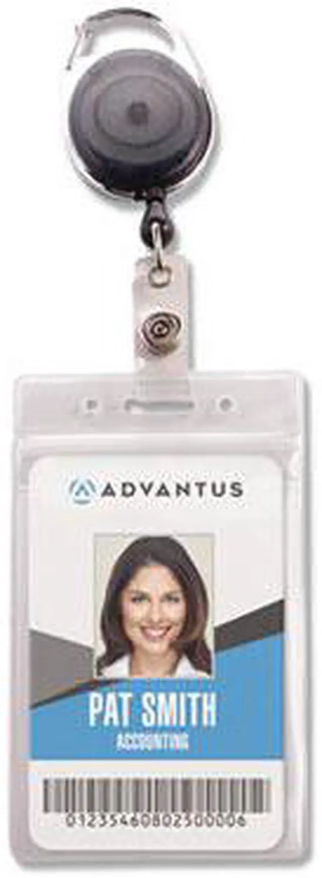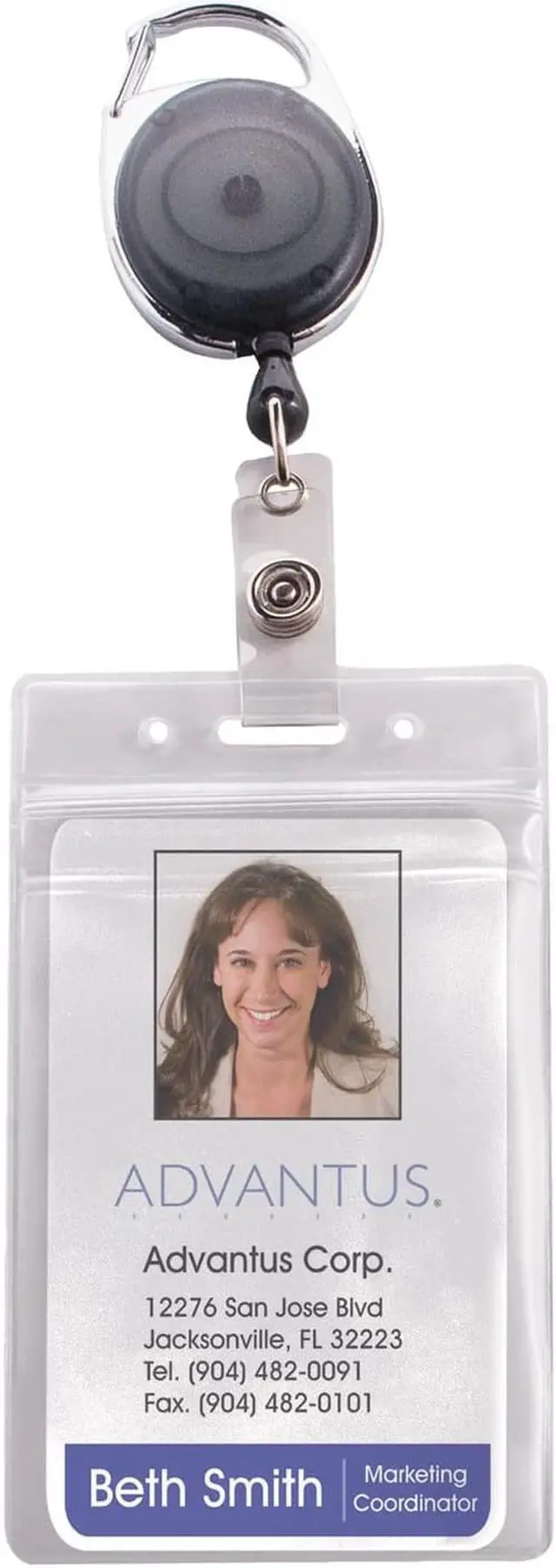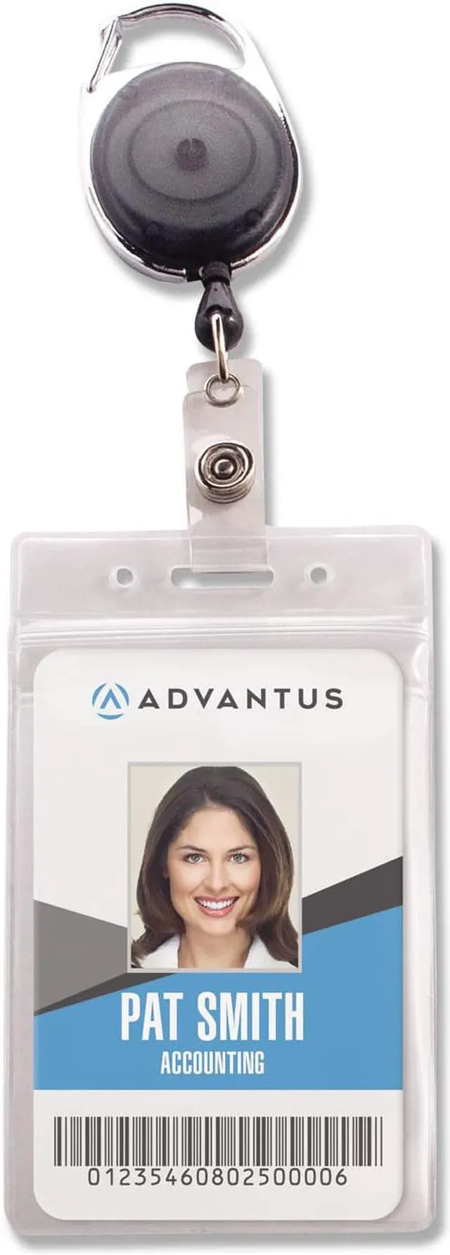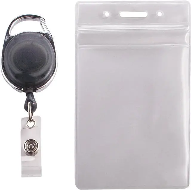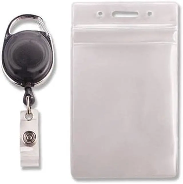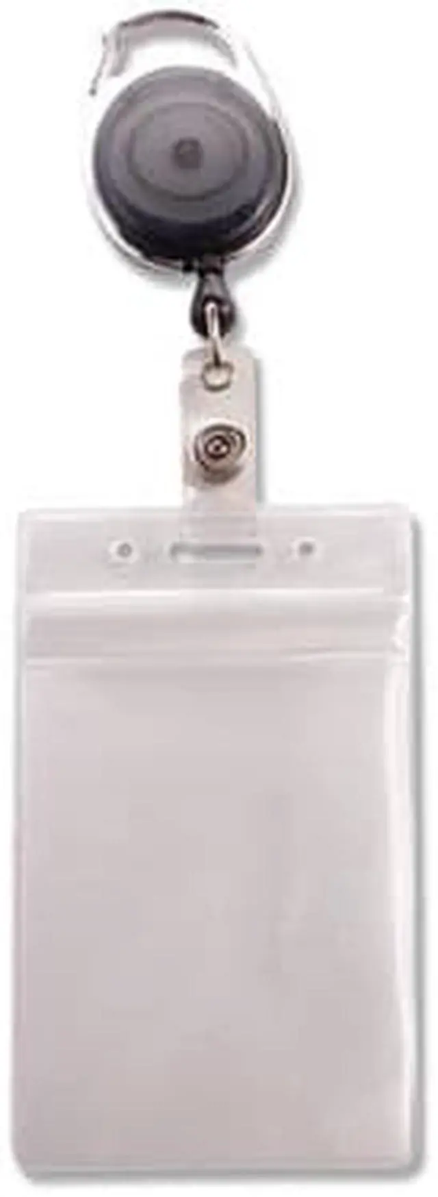 Ensure your credentials remain safe and secure with these Resealable ID Badge Holders. Lightweight, compact design features durable vinyl construction and a seal-top closure to fully protect your security badge on all sides. When sealed, the holder protects your badge from just about everything: water, oil, grease, soil, dust and more. Simply insert your badge and seal the holder as you would seal a resealable sandwich bag. Fully transparent face keeps your ID visible. Die-cut slot and two pre-punched circular holes accommodate lanyards, chains, clips, and badge reels, making it easy to keep your ID with you, no matter where you go. Lanyards, chains, clips and badge reels all sold separately unless otherwise noted. Badge Reel Combo PackIncluded smoke-colored badge reels feature 30" retractable cords, snap-style badge straps and carabiner-style clips. Orientation: Vertical; Name Badge Holder Length: 5"; Name Badge Holder Width: 2.68"; Name Badge Holder Color(s): Transparent Frost.