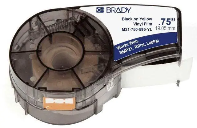 Indoor/Outdoor vinyl labels for the Label Cartridge for BMP21 Series, ID PAL, LabPal Printers. Black ribbon on yellow tape.
