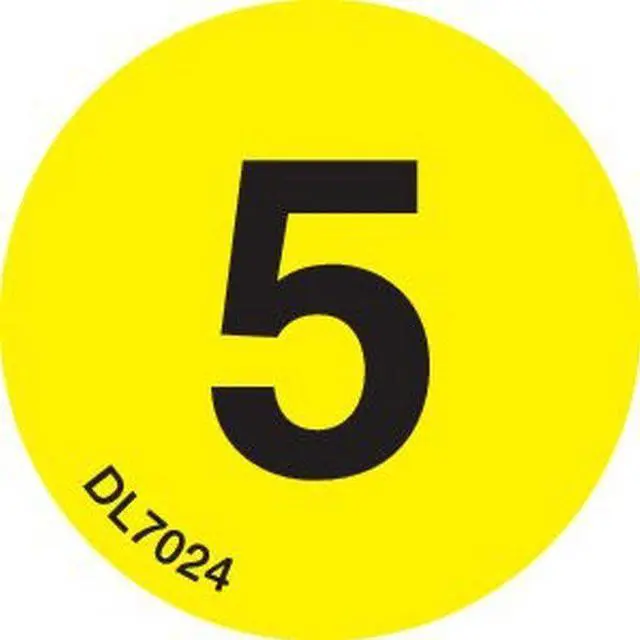 Bright yellow 1-inch round number 5 labels for easy inventory and shelving. 500 per roll on paper stock with silicone-coated liner. Made in USA. Ships in 23 days.