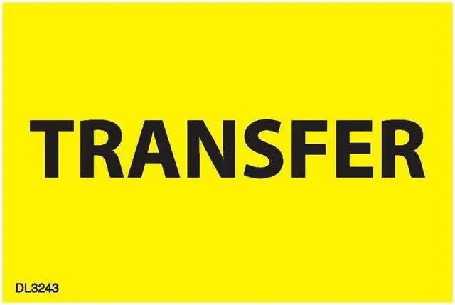 Labels Measure: 2" x 3", 500 Labels per Roll, Label Color: Bright Yellow/Black, "TRANSFER", Paper Label Stock On Silicone Coated Release Paper, Made in USA, Labels Ship in 2-3 Days
