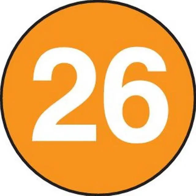 Labels Measure: 3" diameter, 500 Labels per Roll, Label Color: Orange with White "26", Paper Label Stock On Silicone Coated Release Paper, Made in USA, Labels Ship in 2-3 Days