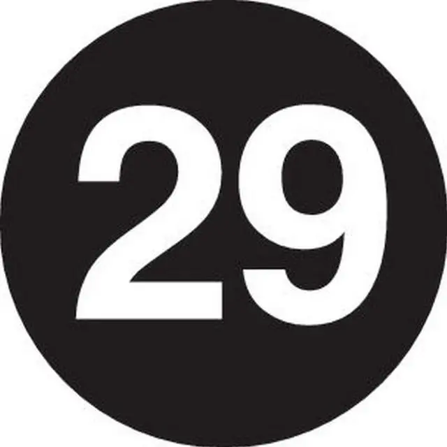 Labels Measure: 2" diameter, 500 Labels per Roll, Label Color: Black with White "29", Paper Label Stock On Silicone Coated Release Paper, Made in USA, Labels Ship in 2-3 Days