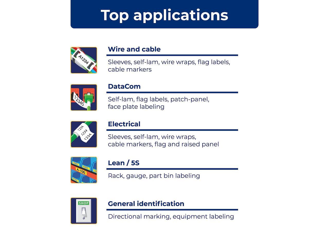 • Uses 90 plus cartridges (continuous tape and pre-sized labels) and 12 different material types