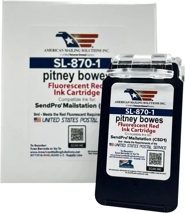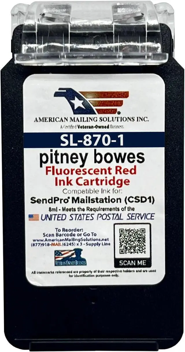 PB COMPATIBLE RED INK CARTRIDGE: Use AMERICAN MAILING SOLUTIONS INC. for your SendPro® Mailstation postage meter today! Our USPS-certified red postage ink cartridge has SendPro Mailstation SL-870-1 compatibility. 1 per box.