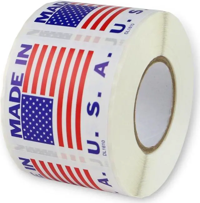FindTape Made-In Labels are made from semi-gloss paper and apparel-safe adhesive backing. You can apply these Made-in USA labels to solid surfaces and clothing. The adhesive is strong yet apparel-safe, so clothing is not harmed. Labels come with a peel-off liner and are packaged in a roll of 500 labels. They lend a professional appearance to your critical shipments. Proudly display the origin of your product with a Made-in USA label featuring the American Flag. Bright red, white, and blue pressure-sensitive labels display the origin (printed and converted in New Jersey).