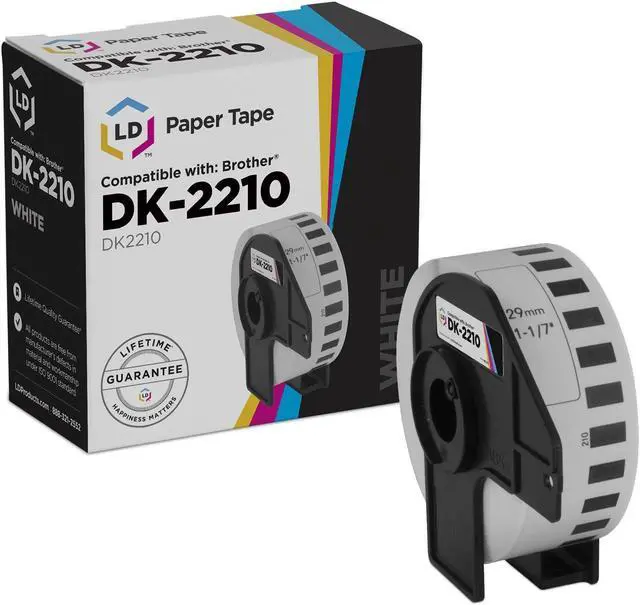 Save and print even more when you shop with LD Products! This offer includes 1 compatible replacement for Brother DK-2210 / DK2210 white paper tape labels ( 1.1 in x 100 ft). Why pay twice as much for expensive brand name labels when our quality replacement printer supplies are backed by a 100% satisfaction and lifetime guarantee? For use in QL-1050, QL-1050N, QL-1060N, QL-500, QL-550, QL-570, QL-570VM, QL-580N, QL-650TD, QL-700, QL-710W, and QL-720NW P Touch printers. Please note, retail packaging may vary, and these labels will only work with printers purchased within the United States and Canada.
