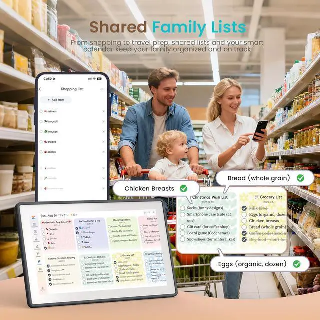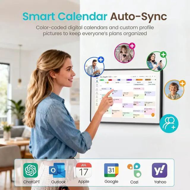 Advanced App Sync with Real-Time Multi-User Updates: Seamlessly sync with Google Calendar, iCloud, Outlook, and more. Update events from your phone or directly on the screen and see changes instantly across devices. Perfect for busy households that need shared visibility and real-time coordination.