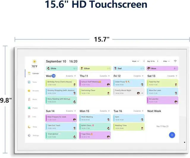 Smart Digital Calendar: flyEVfishs 15.6 HD touchscreen family planner, a digital calendar and chore chart built for all families. Assign colors, add tasks, and helps the whole family easily plan and manage events across different views and features. (No subscription fees required to use.)