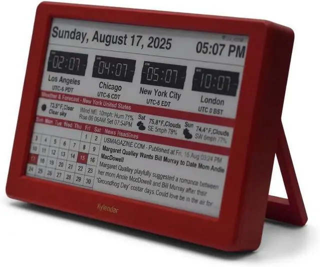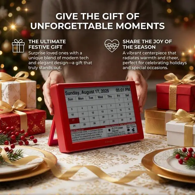 7" Smart E-Paper Desktop Calendar, Wi-Fi Digital Desk Clock with Weather & News, Eye-Friendly E-Ink Display, Auto-Refresh Perpetual Calendar for Office, ABS Shell - Black Red