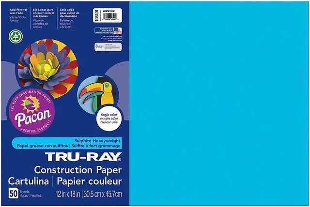 Draw and create with colorful Tru-Ray paper, an excellent choice for use at home or in the classroom. The 50% recycled construction paper is eco-conscious while also offering strength. 76-lb paper offers durability. Can be scored, folded and curled without cracking or tearing. Made from 100% vat-dyed sulphite. Features longer, stronger fibers. Acid free to help prevent fading. Eco-conscious choice - has one or more meaningful eco attributes or eco-labels. Recycled content - helps you save resources and avoid waste. Product contains 50% total recycled content. SFI Certified Forestry. 12" x 18" paper comes in a pack of 50 atomic blue sheets.