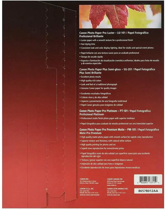 Explore the diverse world of professional photography with the Pro Paper Sampler Pack. This comprehensive set includes 20 sheets in total, with five sheets each of our top four professional photo papers. The pack features Canon's Photo Paper Pro Luster, Photo Paper Pro Semi-gloss, Photo Paper Pro Platinum, and Photo Paper Pro Premium Matte. Each of these high-quality papers boasts unique characteristics, offering a variety of finishes to suit your creative needs. The Pro Luster paper delivers a traditional luster finish that's favored by portrait photographers for its ability to bring out the depth in skin tones, while the Pro Semi-gloss paper offers a subtle sheen that beautifully enhances your images without overwhelming them with shine.