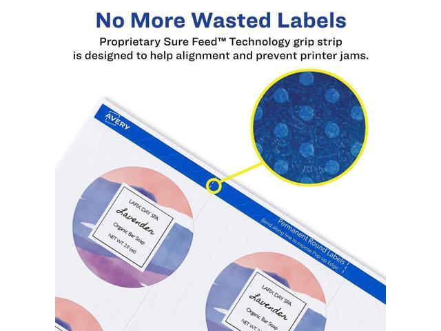 - Get a more reliable feed through your printer with Avery round labels featuring proprietary Sure Feed technology that prevents misalignments and jams