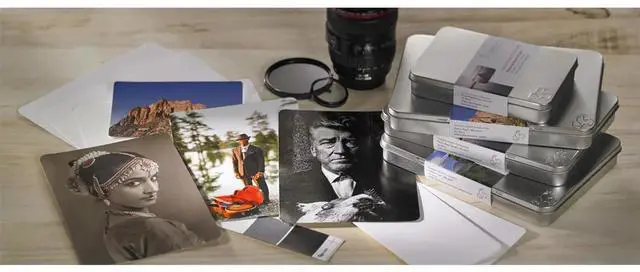 These cards are available in both 10 x 15cm and A5 formats, providing you with a variety of creative design possibilities. The photo cards come packed in an elegant metal tin, embossed with Hahnemuhle's iconic rooster logo. This not only protects your prints but also serves as a compact, mobile archive for your work. Whether you're presenting a mobile portfolio, extending an invitation to an exhibition, or giving away a memento, these photo cards from Hahnemuhle offer a premium solution for your fine art printing needs.