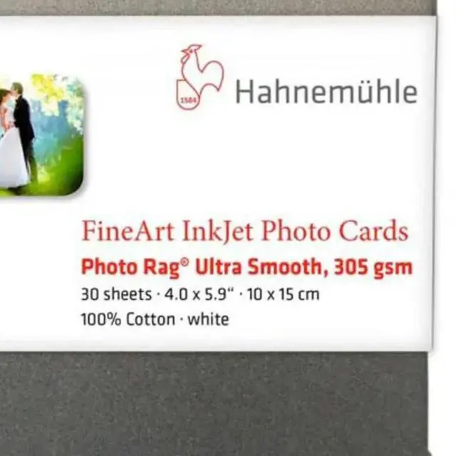 From professional photographers to avid hobbyists, the Photo Rag Ultra Smooth FineArt Inkjet Photo Cards by Hahnemuhle are the perfect medium for showcasing your work. These high-quality, 4x6 inch photo cards offer a versatile platform for capturing and sharing your most cherished memories and unique moments. Designed for use with a wide range of inkjet printers, these durable photo cards are crafted with a rag ultra smooth finish, renowned for its resistance to wear and tear. This ensures that your prints maintain their pristine quality, even with frequent handling. Each pack contains 30 premium FineArt Inkjet photo cards, each boasting beautifully rounded corners for a polished, professional look.