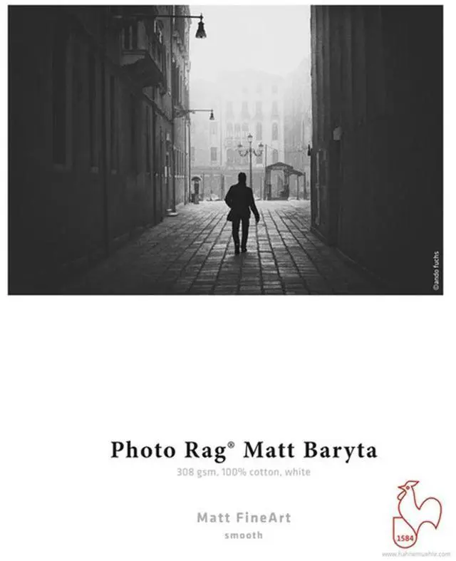 Make your FineArt prints stand out with the exquisite Hahnemuhle Photo Rag Matt Baryta FineArt Inkjet Paper. This premium 308gsm paper is a pioneering addition to the Photo Rag family, offering a unique matt baryta surface that elevates the aesthetic of your artwork. Crafted from pure white cotton, this paper is designed without optical brighteners, ensuring a natural and consistent tone for your prints. The very fine and discreet surface texture of the Photo Rag Matt Baryta paper is meticulously engineered to enhance the visual appeal of your images. When paired with its matt premium inkjet coating, the paper promises superior print quality, enabling the reproduction of vivid colors, intricate details, and deep, rich blacks that rival traditional darkroom prints.