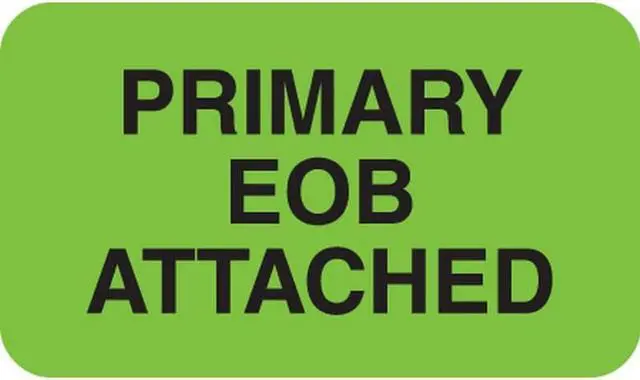 Insurance Collection Labels, PRIMARY EOB ATTACHED - Fl Green, 1-1/2" X 7/8" (Roll of 250) PRIMARY EOB ATTACHED Fl Green 1-1/2" X 7/8" (Roll of 250)