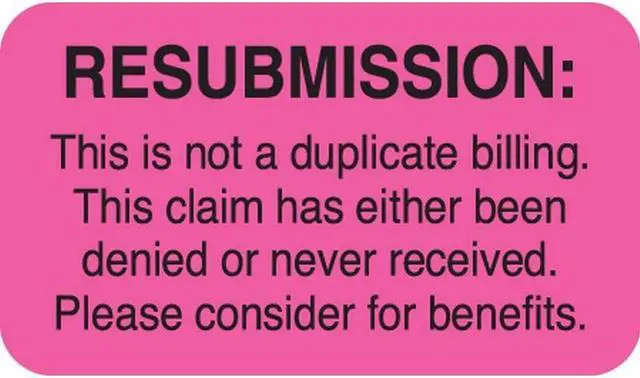 Insurance Collection Labels, RESUBMISSION - Fl Pink, 1-1/2" X 7/8" (Roll of 250) RESUBMISSION" Fl Pink 1-1/2" X 7/8" (Roll of 250)
