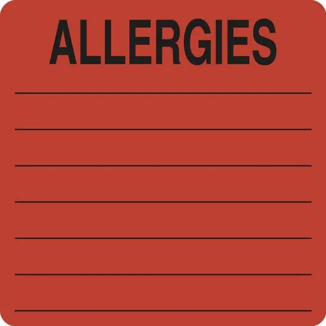 Allergy Warning Labels, ALLERGIES - Fl Red, 2-1/2" X 2-1/2" (Roll of 390) ALLERGIES Fl Red 2-1/2" X 2-1/2" (Roll of 390)