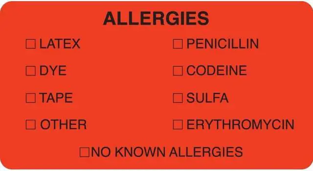 Allergy Warning Labels, ALLERGIES - Fl Red, 3-1/4" X 1-3/4" (Roll of 250) ALLERGIES Fl Red 3-1/4" X 1-3/4" (Roll of 250)