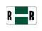 These Safeguard Compatible "R" Labels feature a wrap-around Dark Green bar with a single White stripe and a Black "R" character printed on a White background. Label Size: 1-5/8" W x 15/16" H, Before Folding.