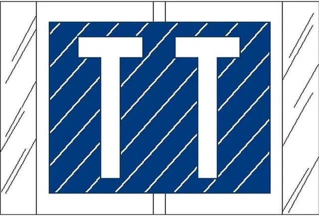 These Tabbies 12000 Compatible "T" Labels are the standard in alphabetic color coding systems. This system features a clear skirt edge and is laminated. The "T" labels contain a White "T" on a Navy Blue background with White diagonal stripes.