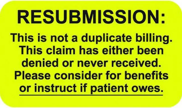 Insurance Labels, "Resubmission", Fluorescent Chartreuse, 1-1/2" x 7/8" (Roll of 250)
