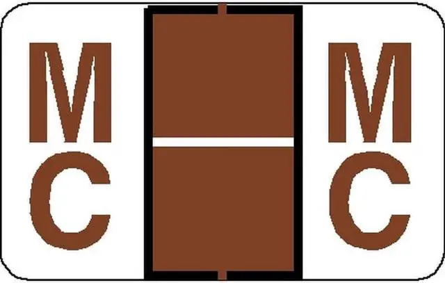 These Tab 1383 Series Compatible "Mc" Labels feature a wrap-around Brown bar with two horizontal White line and a Brown "Mc" printed on a white background. Label Size: 1 1/4" W x 1" H, Before Folding. Vinyl for Protection.
