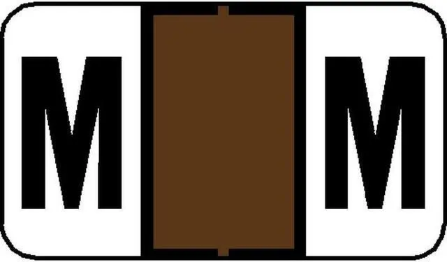 These Tab 7200 Compatible "M" Labels feature a wrap-around Brown-colored bar and a black "M" printed on a white background. Label Size: 1 5/8" W x 15/16" H, Before Folding. Laminated for protection.