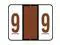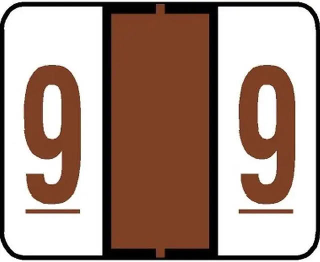 These Tab Compatible Numeric "9" Labels feature a wrap-around solid Brown bar and a Brown 9 printed on a white background. These labels are compatible with Tab Products end tab filing systems. Label Size: 1 1/4" W x 1" H, Before Folding.