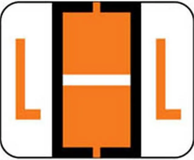 These Smead BCCR/BCCS Series Compatible "L" Polylaminated Labels feature a wrap-around Black bar with a Orange "L" printed on a White background. Label Size: 1-1/4" W x 1" H, Before Folding.
