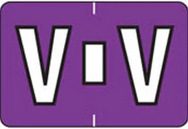 These Colwell Jewel Tone Series Compatible Alpha "V", Polylaminated Labels with a White"V" printed on a Purple background. Label Size: 1 1/2" W x 1" H, Before Folding.