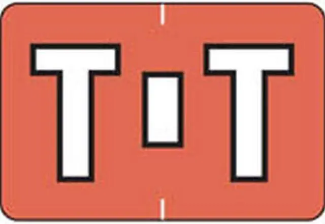These Colwell Jewel Tone Series Compatible Alpha "T", Polylaminated Labels with a White"T" printed on a Salmon background. Label Size: 1 1/2" W x 1" H, Before Folding.