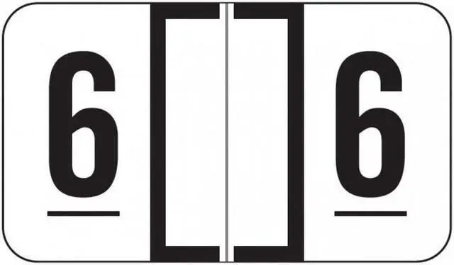 These Jeter 0300 Compatible Numeric "6" Labels feature a wrap-around White, bar with a Black "6". Label Size: 1-5/8" W x 15/16" H, Before Folding. Laminated for Protection