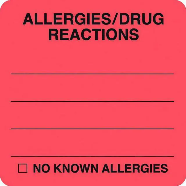 Allergy Warning Labels, ALLERGIES / DRUG REACTIONS - Fl Red 2" W X 2" H (Roll of 250)