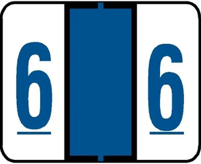 These Jeter 6100 Compatible Numeric "6" Labels feature a wrap-around solid Blue bar and a matching Blue "6" printed on a white background. Label Size: 1 5/8" W x 15/16" H, Before Folding. Laminated for protection.