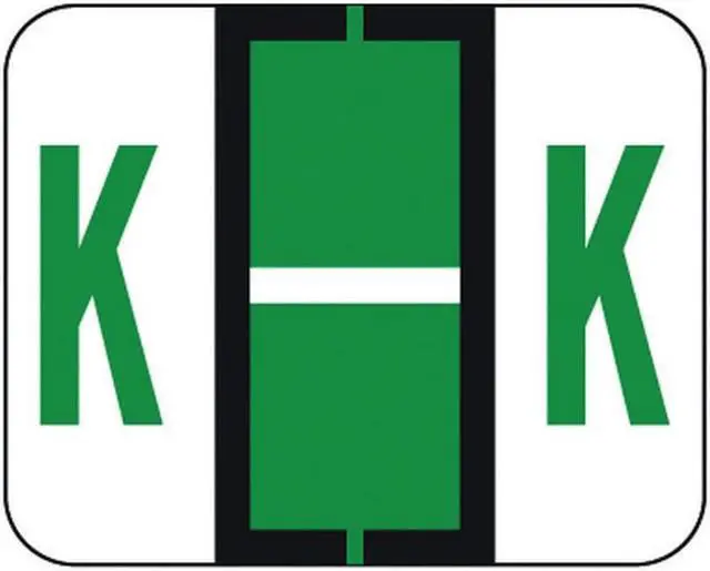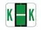 These File Doctor FDAV Series Compatible Letter "K" labels feature a wrap-around Black bar printed on a Dark Green, and White background. Vinyl Stock, Label Size: 1-1/4" W x 1" H, Before Folding.